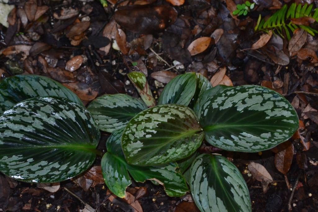 The Cornukaempferia aurantiflora has been growing much better this year, perhaps due to some homemade mulch (chopped up oak leaves). It bloomed earlier, and I don’t have a good picture of the bright orange flower. I’ve seen it marketed as a cultivar ‘Jungle Gold’ and I’m not sure if this is just some marketing ploy. Note the variation in markings on the leaves.