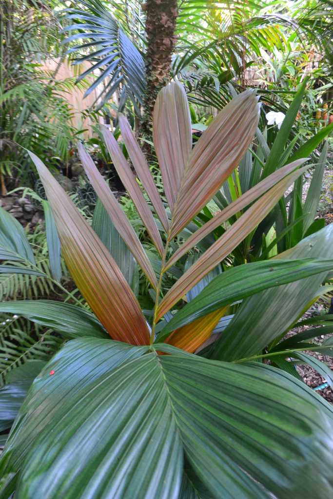 Palm is from the lowland rainforests of New Guinea. So, it needs a shady location, wet soil and humid conditions. It is a slow grower, My palm is about 5 ft tall. It can grow to 15 – 20 ft tall according to palm textbooks.