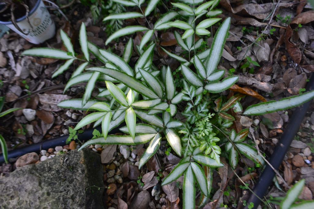 Silver Ribbon Fern is common in Florida. In the center of the photo, you’ll see a Silver Lace Fern. In my well mulched backyard, these two ferns seem to sprout up nearly together. They are Zone 8 to 11 plants and like moist conditions and partial sun. They will spread in shady areas. It is a very available fern.