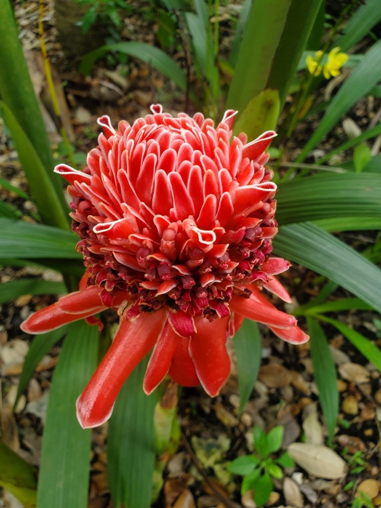My Kaempferias are dropping, particularly the Satin checks. Red torch ginger (Etingera elatior) still has its bloom. I’ve never tried it, but Wikipedia says that all parts are edible. The same goes for red button ginger. The flower shoots taste like grapes.