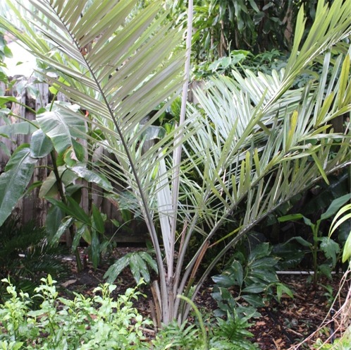 The Buri palm grows slowly and has a beautiful whitish underside. It is very drought resistant. It is native to northeast Brazil, in the state of Bahia. The new spear leaf is around 6′ tall, and just starting to open.
